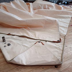 Les voiles quant à elles sont presque terminées. il reste quelques œillets à poser sur la grand-voile ; foc et trinquette sont également presque prêts. Nous devrions les avoir courant février.