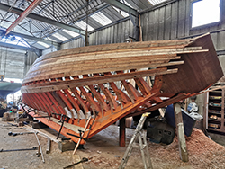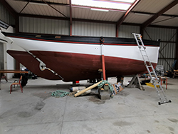 Il est à présent retourné sur son lieu de naissance où nous le terminons. Nous travaillons maintenant sur les espars, les voiles et le gréement.